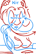 Heute: Lieblingspfeil Nr. 202 Engelmacher Der Fahrer dieses LKWs hat mich Radfahrer neulich übersehen und nahezu um-, also totgefahren. Kurz nach diesem Beinah-Unfall hielt der LKW und ich entdeckte den Doppel- Pfeil an seiner Seite, dessen Bedeu- tung nur diese sein kann: wenn du von diesem Fahrzeug geschwind tot- gefahren wirst (blau-weiß-gestreifter Pfeil), kommst du, so verspricht der schwarze Pfeil, in den Himmel und nicht in die Hölle. |