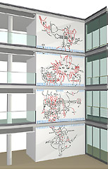 Wandzeichnungen für zwei je 12 Meter hohe, sich gegenüber liegende, Wände in einem Atrium der Landesbausparkasse Nord in Hannover. [Mehr hier]