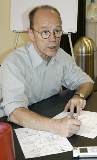 | Frage: Haben Sie den Pfeil dort für uns gesteckt, oder ist es nur Zufall, dass er da ist? Spiekermann: Habe ich nicht gemacht. Es könnte aber auch der Anfang eines Tannenbaumes sein. Wir können gerne einen Tannenbaum draus machen! (steht auf und steckt aus dem Pfeil einen Tannenbaum) Ich habe auch vor Jahren schon eine Weihnachtskarte gestaltet, für die ich aus Pfeilen Weihnachtsbäume gemacht habe. Ein amerikanischer Designer machte vor Jahren mal eine Aktion, bei der jeder einen Font machen sollte und der Erlös zu Gunsten der Dritten Welt gespendet werden sollte, damit die Hungernden in Dharfour sich Macs kaufen können. Dafür habe ich mangels Zeit ganz schnell aus zwei oder drei Pfeilen einen Weihnachtsbaum gemacht. Der Pfeil ist wunderbar praktisch... Ich bin ein Oberfan vom Pfeil. Wenn es ihn nicht schon gegeben hätte, hätte ich ihn wohl erfunden. Ich weiß, dass ich sehr viel Material über den Pfeil habe, aber ich finde es nicht auf meinen tausenden von Festplatten. Der Pfeil ist das genialste Symbol. Ich schreibe immer in Faxen und Briefen: Erik (von Erik)