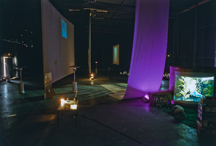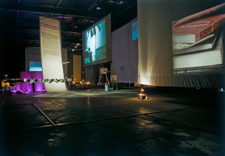 | Projektionen von Bedwyr Williams (Video), Hannes Kater (Projektion eines Textes per Overheadprojektor),Anna Gollwitzer (auf kleiner Leinwand auf Staffelei und groß auf Prospekt), Bjørn Melhus (weit oben mit seinem Astronauten-Film) und Pierre Sondeijker (Dia (Bücher, im Vordergrund rechts) (v.l.n.r.). Außerdem die hängenden Schwimmflügel in Projektion von Andrea Böning und die violett angestrahlte Hütte von Reiner Matysik |