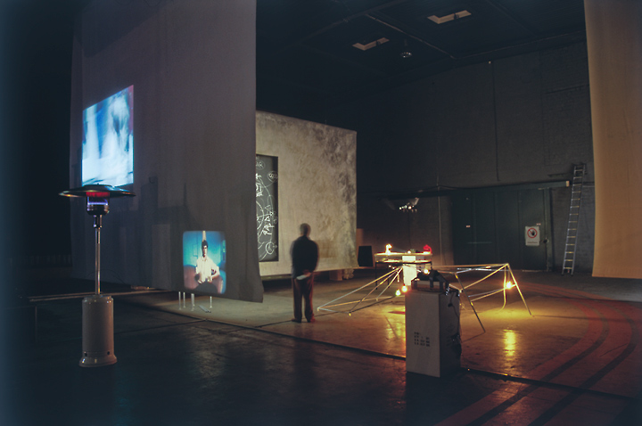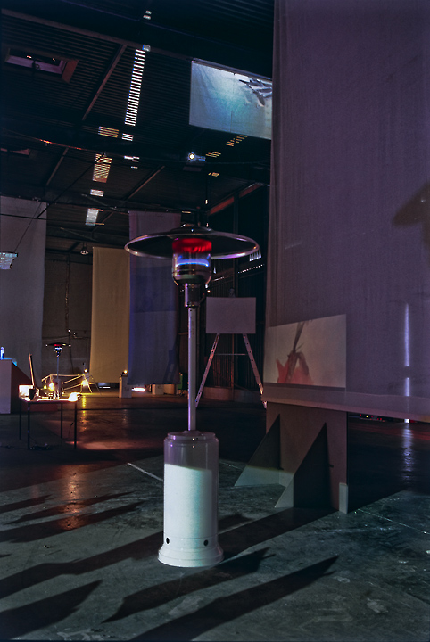 | Der Eingang zur Halle (ganz links der Lichtspalt), 2 Heizpilze, ein großer Prospekt (hängende Leinwand) mit der Projektion des Videofilms von Bjørn Melhus, ein Heizpilz, der Prospekt (die Leinwand) von Hannes Kater von hinten (die einzigste mit Boden und (fast) Deckenkontakt mit einer gewissen "Brückenfunktion"... und eine Projektion (Dia) von Reiner Matysik (v.l.n.r.) | |||||