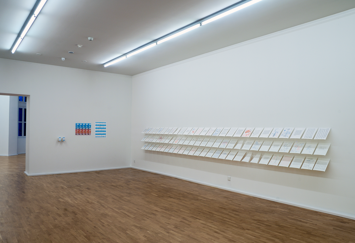 68 Zeichnungen auf Zeichnungshaltern im Souterrain der Galerie Poll für die Gruppenausstellung "Mit Blei- und Farbstift – zeitgenössische Zeichnungen", 2012
