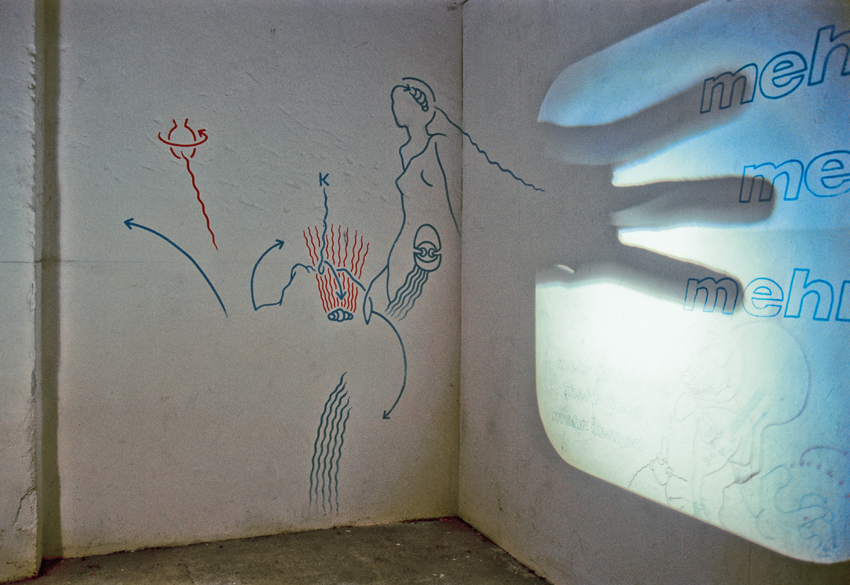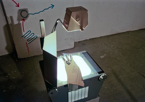 Eine Idee, die mit und nach einer, in einem 3D-Programm gebauten, Einladungskarte realisiert werden sollte: die Situation sollte im Ausstellungsraum so, wie sie auf der vorab produzierten Einladungskarte zu sehen ist, im Ausstellungsraum nachgebaut werden: eine aus Pappe geschnittene Schablone erzeugte, auf dem Projektor liegend (siehe unten), den Schatten der Hand mit den 3 Fingern.