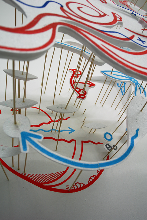 vor einer kleinteiligen blauen Verdichtung (blättrig, also organisch), die direkt auf die Wand