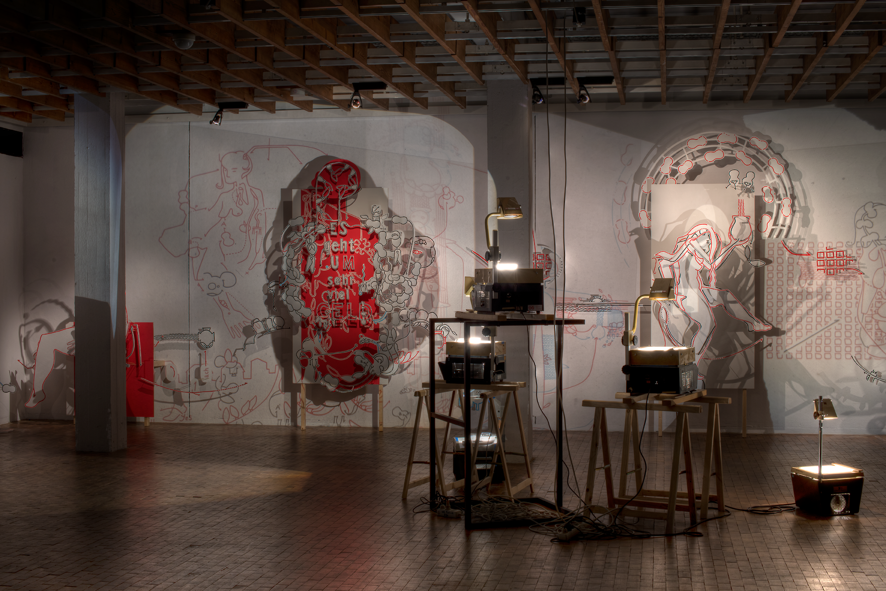 | Station 03 Körpergrenzen (von Pfeiler etwas verdeckt), Station 04 Es geht um viel, Projektoreninsel und Station 05 Mit dem Geld tanzen mit Projektionen [Foto vom 12.10.2012] |
