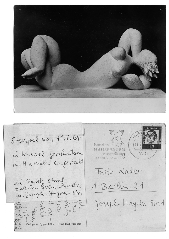 Postkarte von 1964 Katers Mutter an seinen Vater: „[...] diese altbekannte Plastik traf ich auf der Documenta wieder und begriff, warum sie nicht mehr vor Deinem Haus [gemeint ist: Joseph-Haydn-Straße 1] steht.“