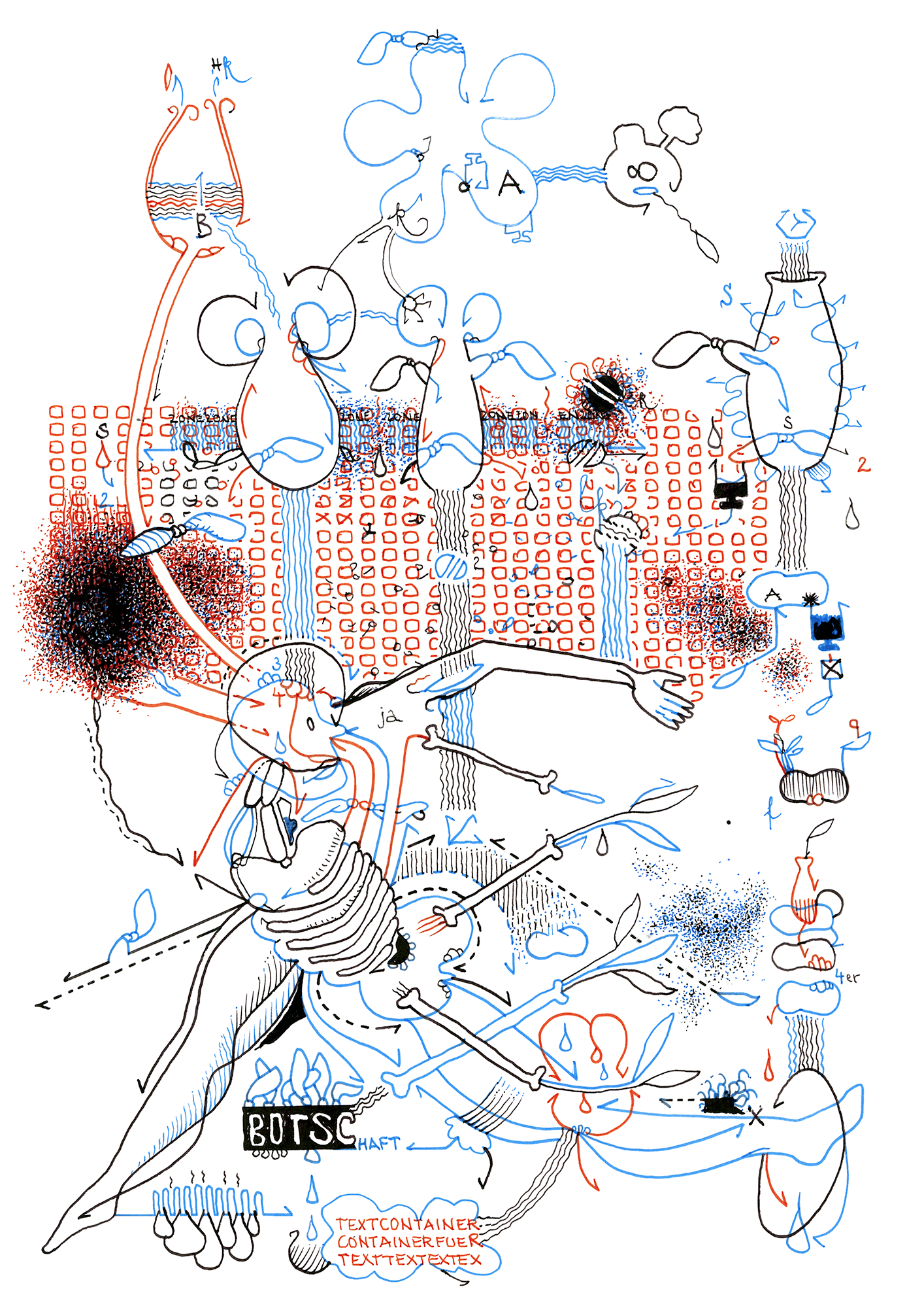 | Zeitgenössische Relevanz: KI und algorithmische Bedeutung Diese pragmatische Lösung des Universalienstreits ist hochaktuell. In Zeiten von KI und algorithmischen Bedeutungsproduktionen stellt sich neu die Frage: Sind Bedeutungen stabile Entitäten oder emergente Prozesse? Katers System antizipiert diese Problematik: Bedeutungen als evolutionäre Prozesse, die weder vollständig deterministisch noch vollständig arbiträr sind. Die partizipative Dimension der Auftragszeichnungen fügt eine soziale Komponente hinzu: Bedeutungen entstehen in der Interaktion zwischen verschiedenen Erfahrungswelten. Das System wird zum kollektiven Experiment mit der Frage: Wie können persönliche Notationssysteme intersubjektiv funktionieren? Die Antwort: Durch Transparenz der Regeln bei Flexibilität der Anwendung. Strukturierte Improvisationen Kunsthistorisch lässt sich das System als Form der strukturierten Improvisation verstehen. Wie im Jazz gibt es Standards (die etablierten Darsteller), aber die eigentliche Kreativität entsteht in der spontanen Kombination. Das löst ein fundamentales Problem künstlerischer Praxis: Wie kann man anfangen, ohne zu wissen, was entstehen soll? Katers System bietet eine Infrastruktur für Improvisation es lässt den Künstler "nie um den nächsten Strich verlegen sein“. Diese organisierte Spontaneität ist weder pure Planung noch pure Intuition, sondern ein kultiviertes Gespür für emergente Möglichkeiten. Das System schafft Bedingungen, unter denen etwas entstehen kann, was nicht vollständig vorhersagbar ist. Familienähnlichkeiten und Cluster-Dynamik Die interne Struktur der Darsteller folgt einer Logik der Familienähnlichkeiten im Sinne Wittgensteins. Es gibt keine essentiellen Definitionen, sondern überlappende Ähnlichkeitsbeziehungen, die Cluster ohne feste Grenzen bilden. Diese Cluster-Dynamik ermöglicht sowohl Stabilität als auch Wandel: Neue Darsteller können sich an bestehende Bedeutungsfelder anlehnen, sie erweitern oder modifizieren, ohne das Gesamtsystem zu sprengen. Das System lernt durch Verwendung, behält aber eine erkennbare Identität. Die Materialität des Visuellen und implizite Semantik Ein entscheidender Aspekt ist die konsequente Orientierung an den "Gesetzen des Bildes" statt denen der Schrift. Diese Materialität ist nicht beliebig sie nutzt spezifische Eigenschaften visueller Wahrnehmung und etabliert eine implizite Semantik: |