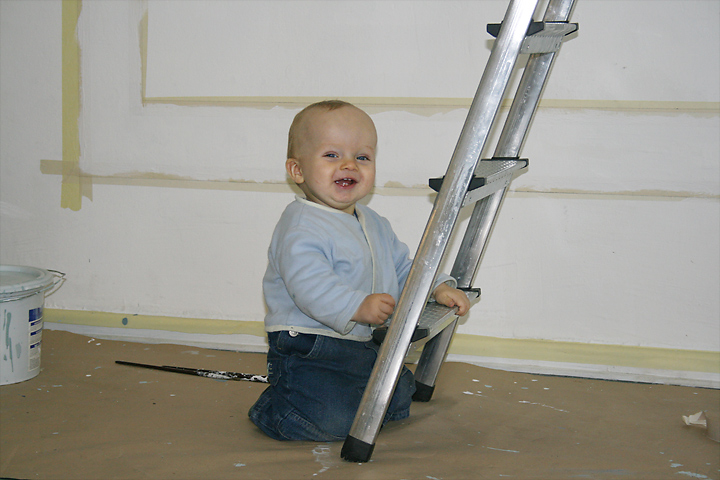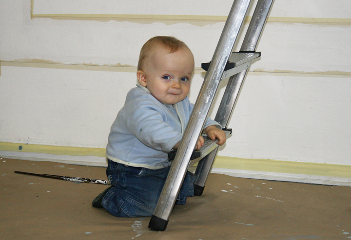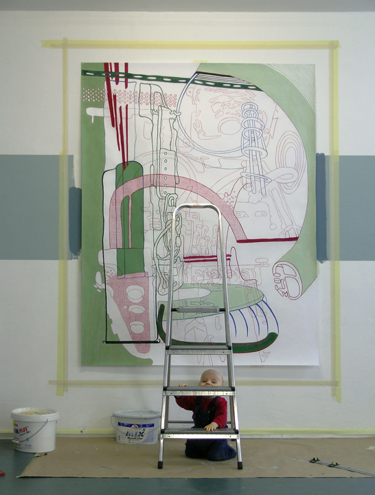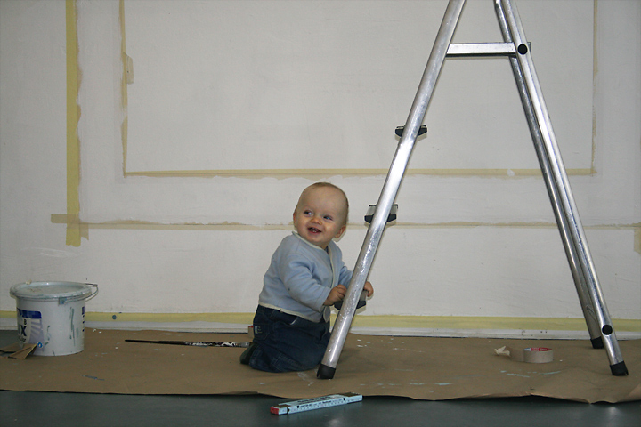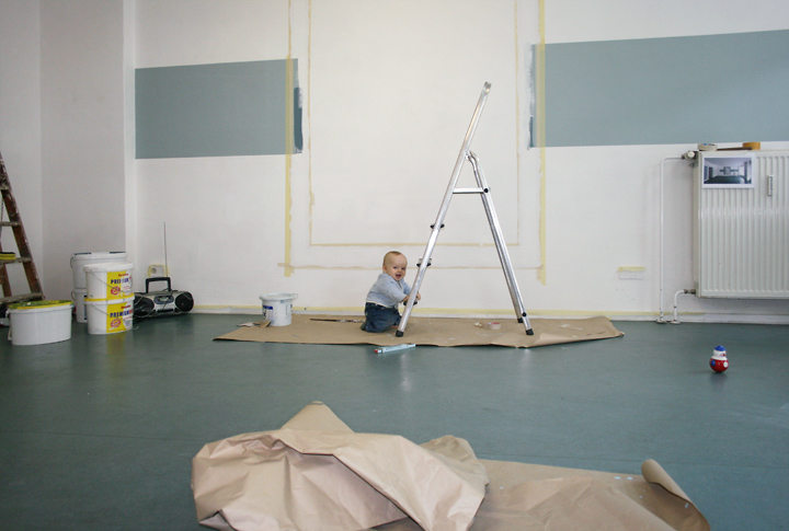H. in der Galerie beim Aufbau der Ausstellung von A.R.