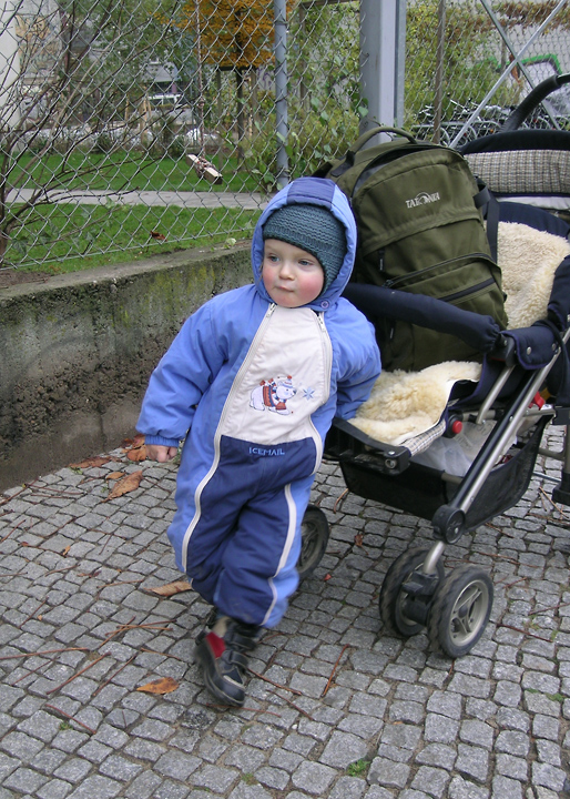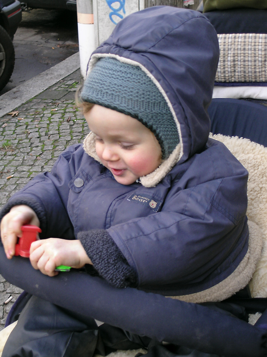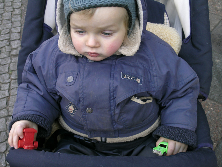 | Ein anderer Tag, ein anderer Ausflug, und H. ist etwas angeschlagen und hat eine Holzlokomotive (rot) und ein Metallauto (grün) dabei... |